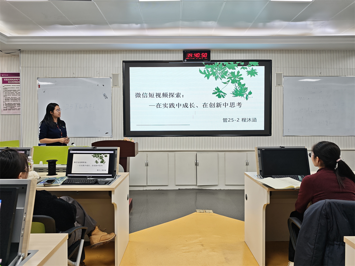 最后,前期在自媒体实践任务中表现突出的管25-2班程沐涵同学作为学员代表发言。她以“微信短视频探索:在实践中成长、在创新中思考”为题分享了参与实践任务的收获与感悟,表达了对即将开始的微专业学习的期待,并表示将珍惜宝贵的学习机会,努力提升综合能力,为未来的创新创业实践打下坚实基础。