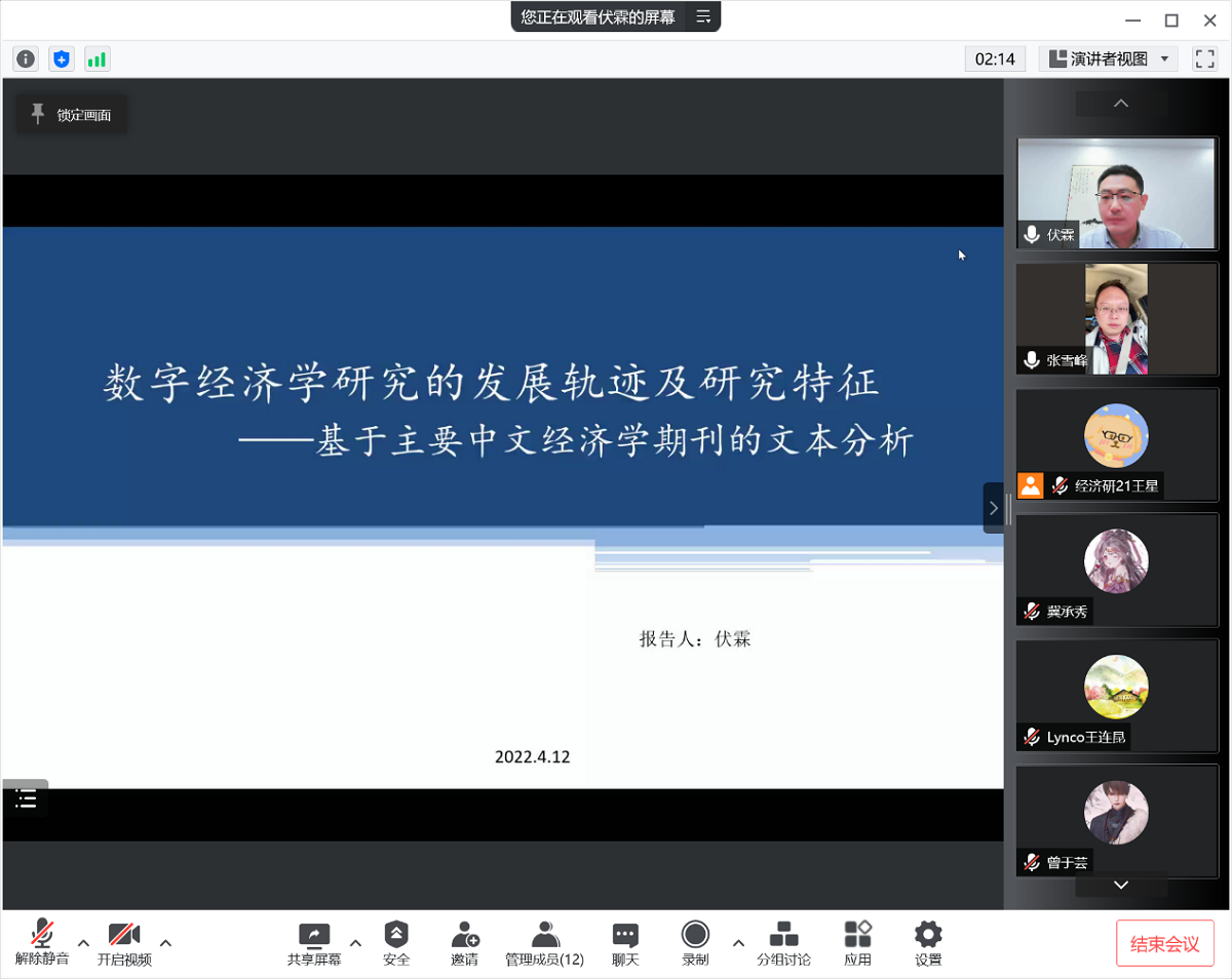 4月15日下午,应太阳集团tyc151cc邀请,中央财经大学经济学院副教授、现任中央财经大学经济学院副院长伏霖为我校师生作了题为“数字经济学研究的发展轨迹及研究特征—基于主要中文经济学期刊的文本分析”的线上学术报告。报告会由经济系张雪峰副教授主持,经济系研究生参会。