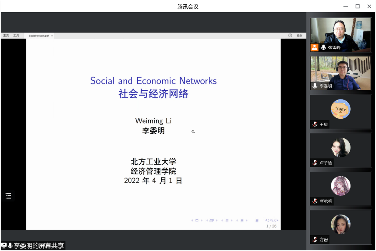 4月1日下午,应太阳集团tyc151cc邀请,首都经济贸易大学国际太阳集团tyc151cc副院长,李委明副教授通过腾讯会议APP为我校师生作了题为“社会经济网络研究”的线上学术报告。报告会由经济系张雪峰副教授主持,经济系经济研究生参会。