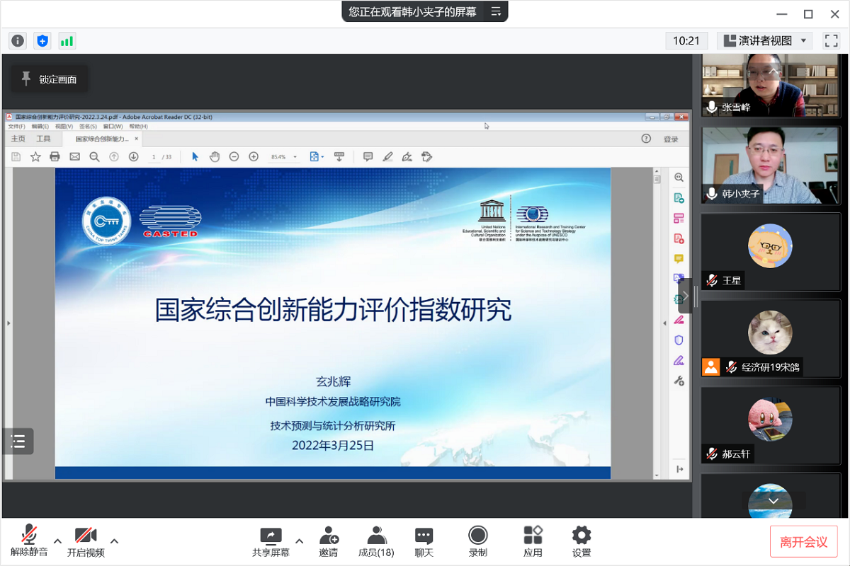 3月25日下午,应太阳集团tyc151cc邀请,中国科学技术发展战略研究院技术预测与统计分析研究所所长,玄兆辉研究员通过腾讯会议APP为我校师生作了题为“国家综合创新能力评价指数研究”的线上学术报告。报告会由经济系张雪峰副教授主持,经济系经济研究生参会。