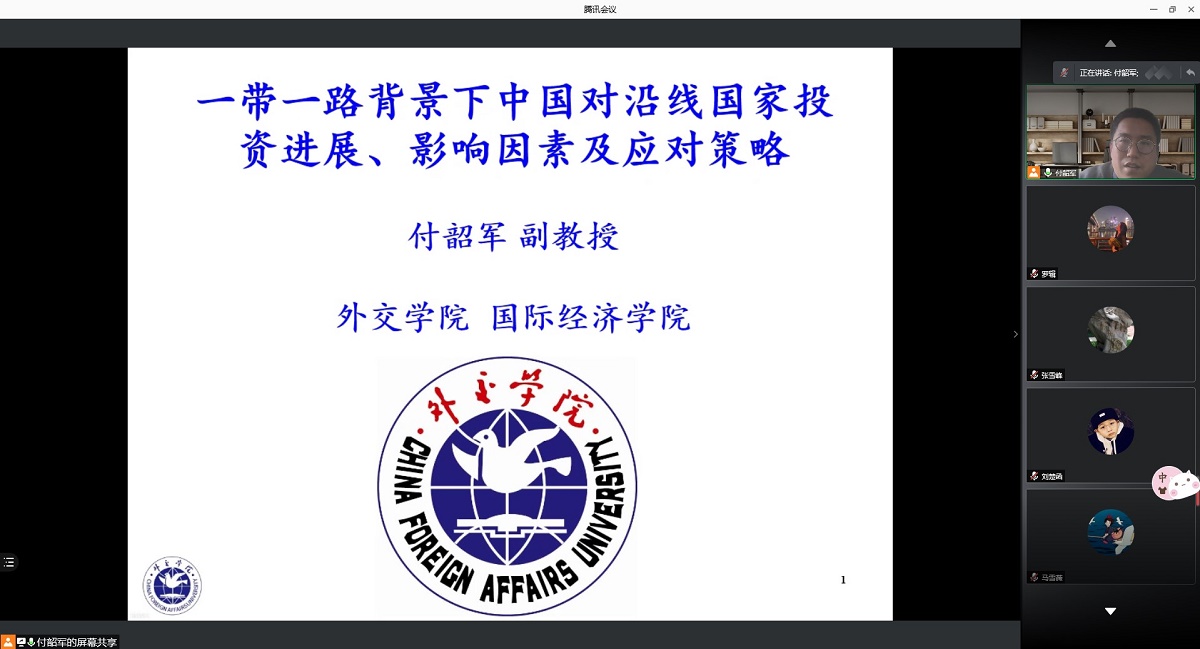 4月22日下午,应太阳集团tyc151cc邀请,外交学院国际经济学院副教授、中国人民大学六西格玛管理研究中心研究员付韶军通过腾讯会议APP为我校师生作了题为“一带一路背景下中国对沿线国家投资进展、影响因素及应对策略”的线上学术报告。报告会由经济系张雪峰副教授主持,经济系经济研研究生与本科生参会。