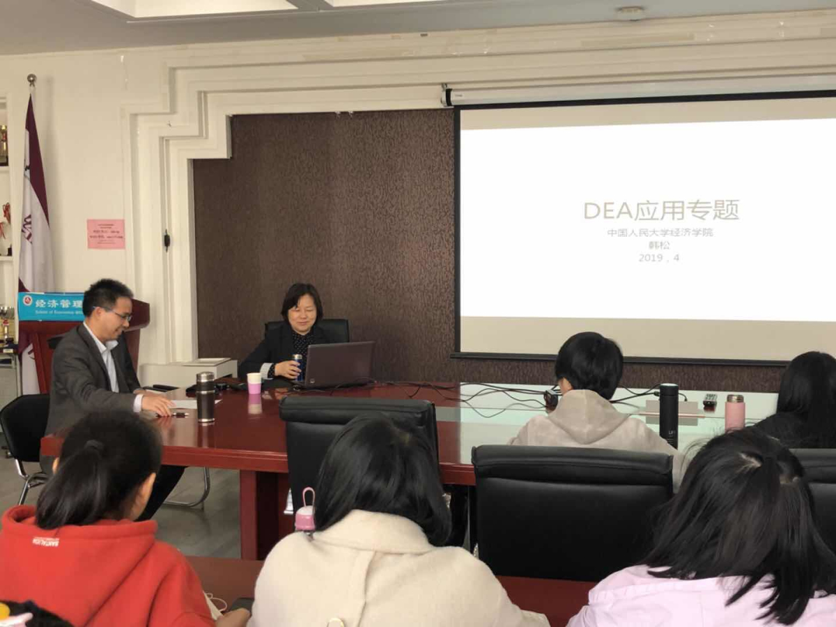 4月12日下午,应太阳集团tyc151cc邀请,中国人民大学经济学院韩松教授在励学楼301会议室为师生作了题为“DEA方法应用专题”的学术报告。报告会由经济系王书平副教授主持。
