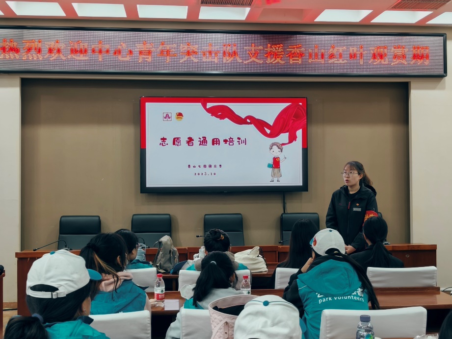 在活动开始前,香山公园管理处团委书记张紫莹对志愿者们进行了详细的培训,指导大家如何有效地为游客提供志愿服务。张老师强调,当前正值枫叶最佳观赏期,志愿者们需要在各个服务点位上帮助缓解公园在旺季的人流压力,希望大家秉承全心全意为游客服务宗旨,以饱满的热情投入到各项志愿活动中。